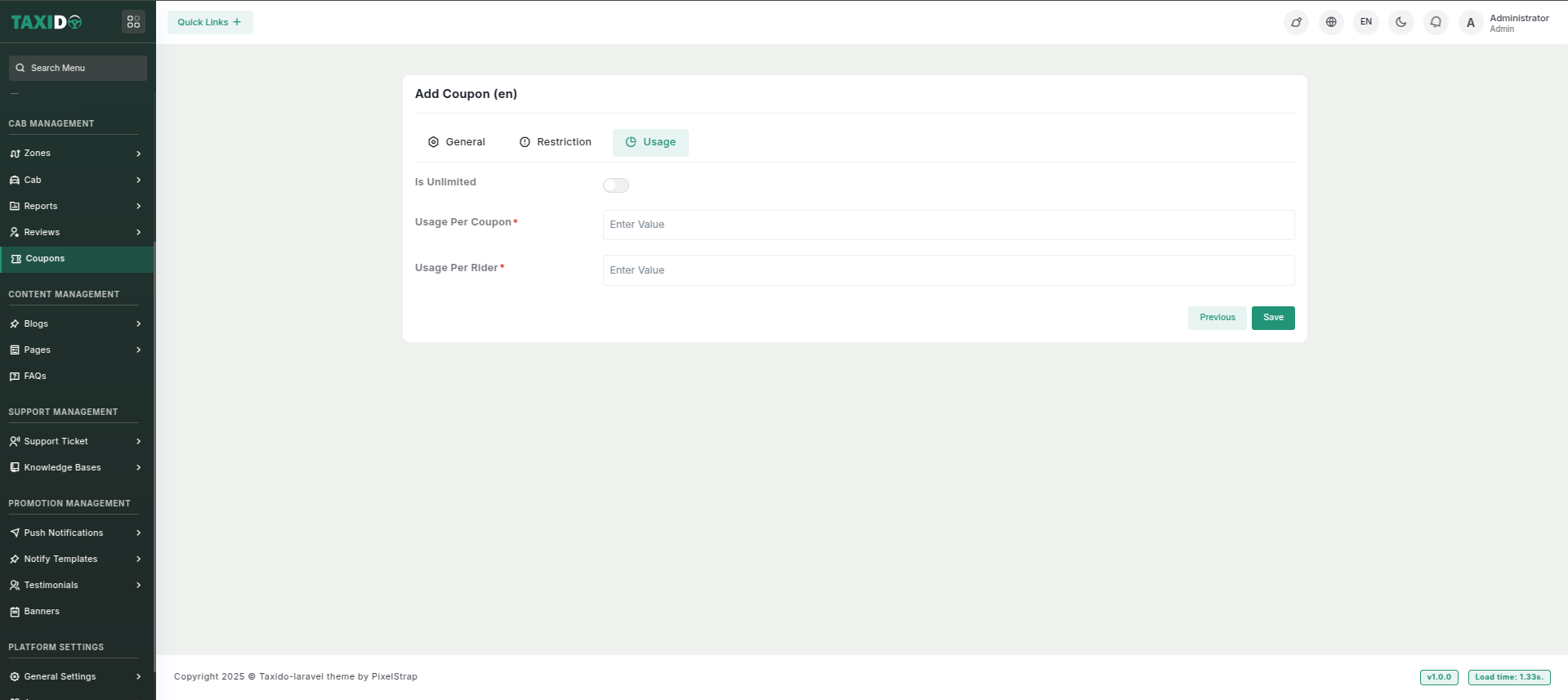 - Is Unlimited: Use this option to activate or deactivate unlimited usage of the coupon. If enabled, the coupon can be used an unlimited number of times; If disabled, you must specify the Usage Per Coupon and Usage Per Rider value.