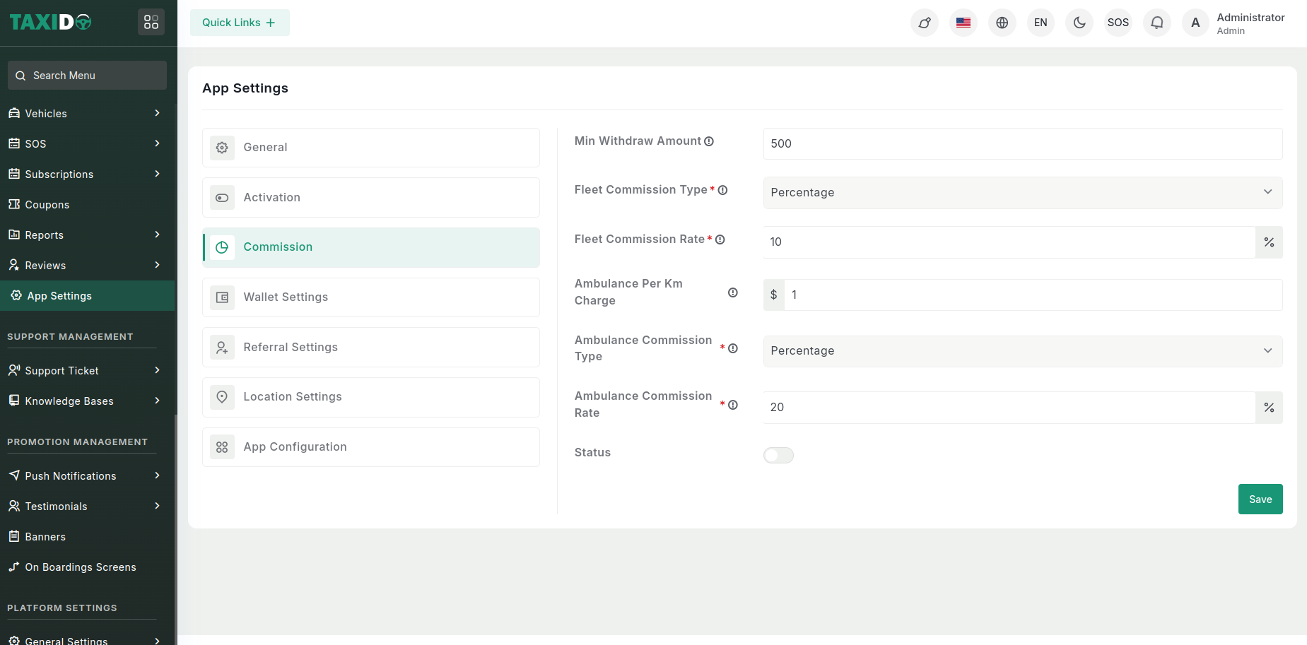 - Ambulance Commission Type: Determines the type of commission applied to ambulance services. It can typically be set as either a fixed amount or a percentage of the total fare.