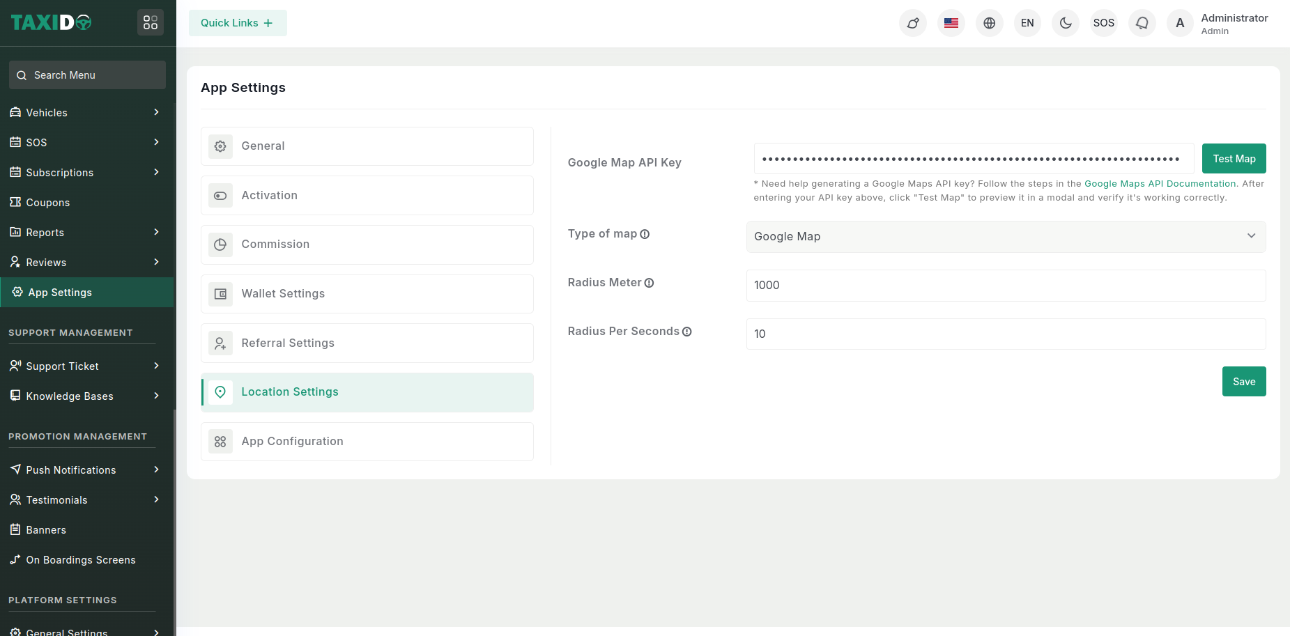 - Google Map API Key: The API key used to integrate Google Maps into the application. It enables features like live tracking, address autocomplete, geolocation, and map rendering within the user and driver apps.