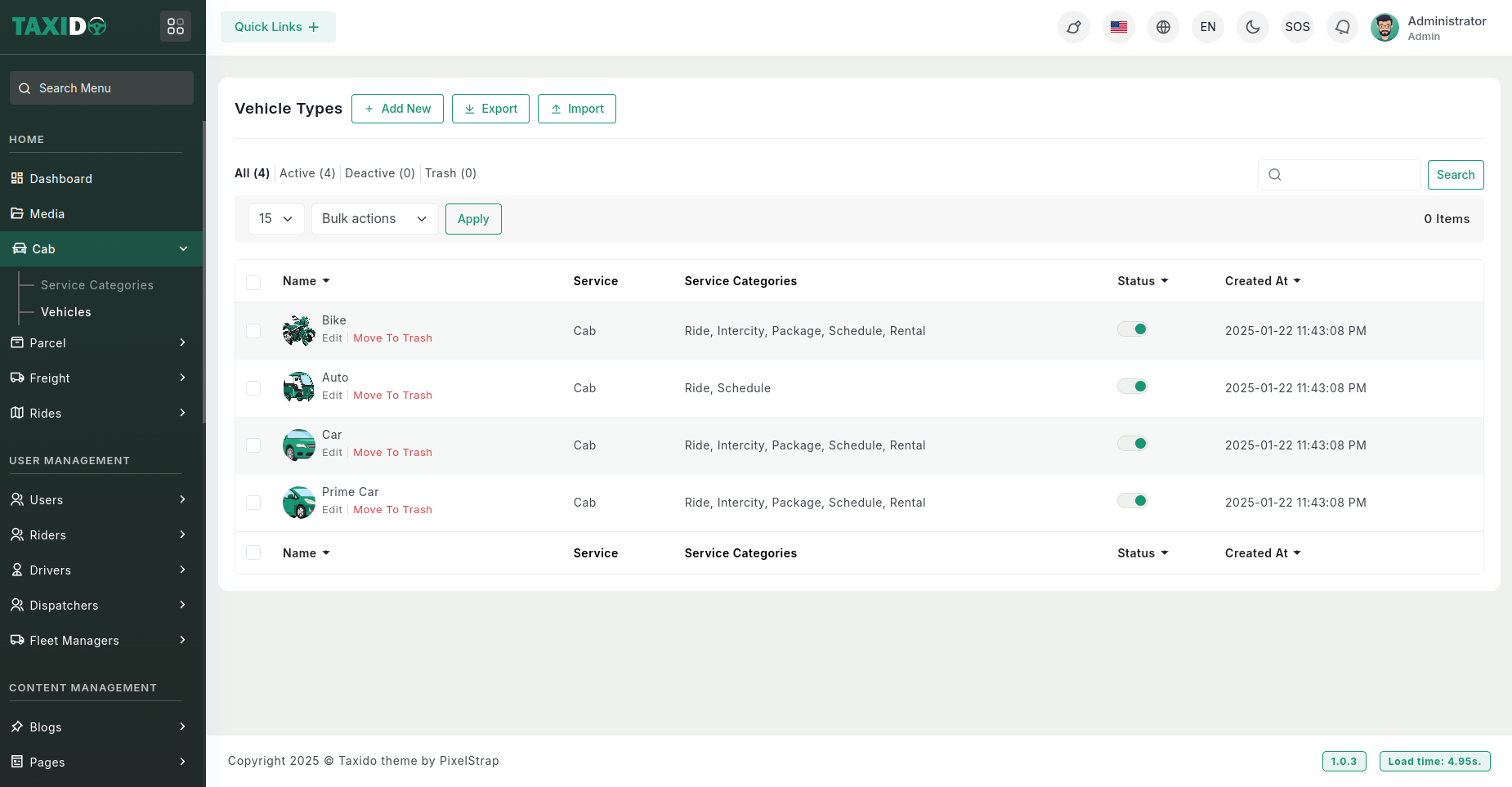 - Add New: The button allows you to create a new vehicle type by entering relevant details such as name, image, charge settings, commissions, and additional info. It provides an easy way to expand the list of vehicle types in the system.