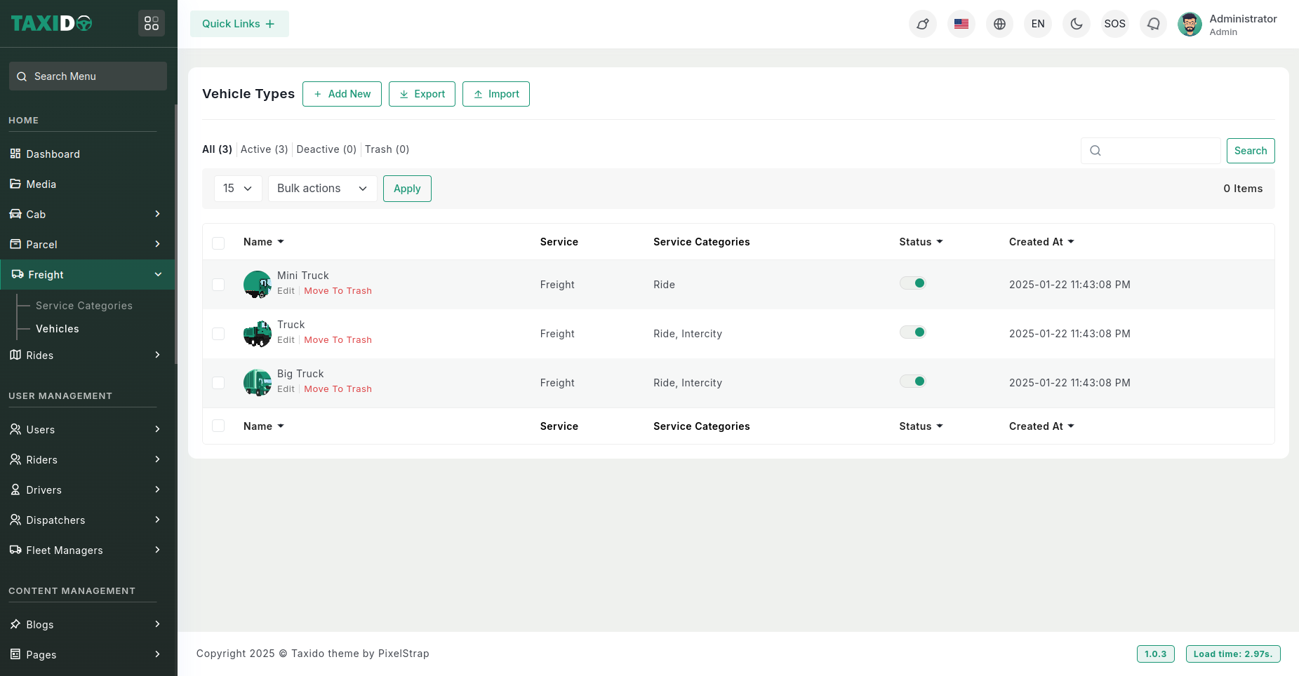 The system supports multiple services such as Cab, Freight, and Parcel, each of which can be further categorized into service categories like Ride, Intercity, Package, Schedule, and Rental. Vehicle types are assigned to these services and categories to determine their operational scope and pricing structure.