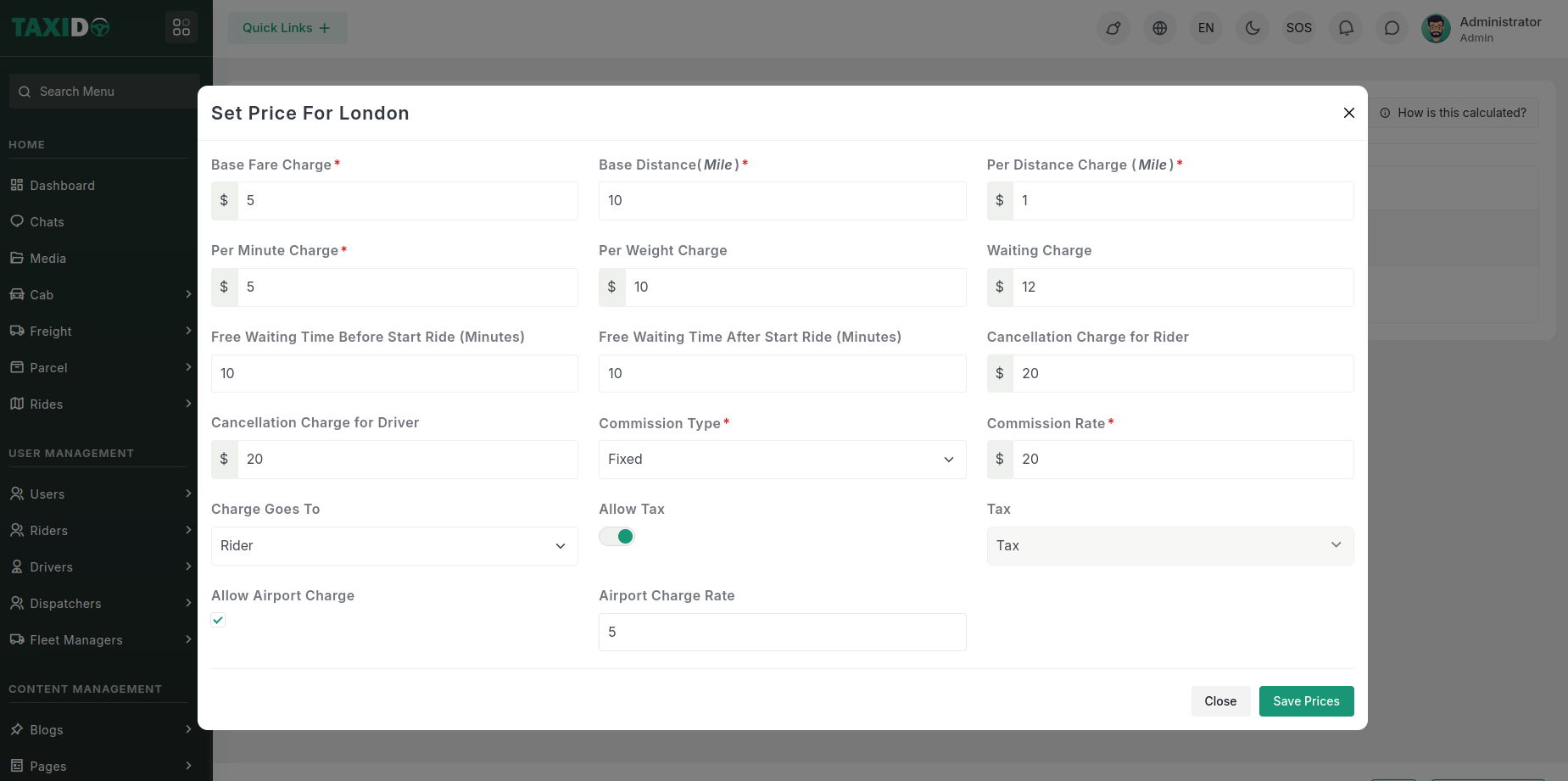 - Per Distance Charge (Mile) * - Cost per mile beyond the