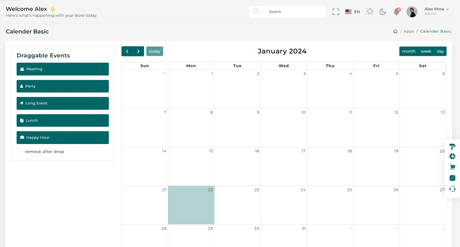 <FullCalendar eventClick={calenderEventClick} rerenderDelay={10} eventDurationEditable={false} editable={true} droppable={true} plugins={[dayGridPlugin, interactionPlugin]} events={state.calendarEvents} />