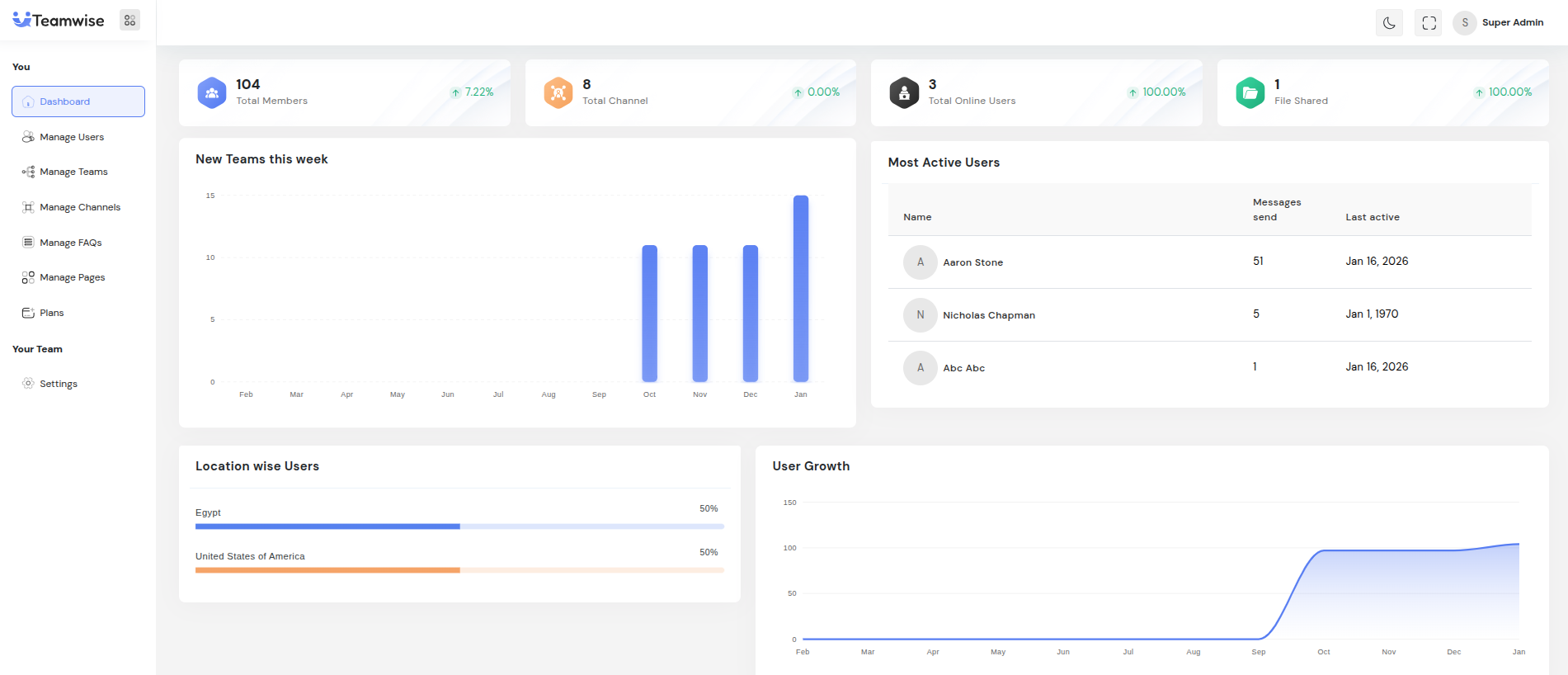 The Dashboard acts as the control center for super administrators, offering a real-time overview of Teamwise performance. It highlights key platform statistics, growth trends, and engagement insights to support data-driven decisions.