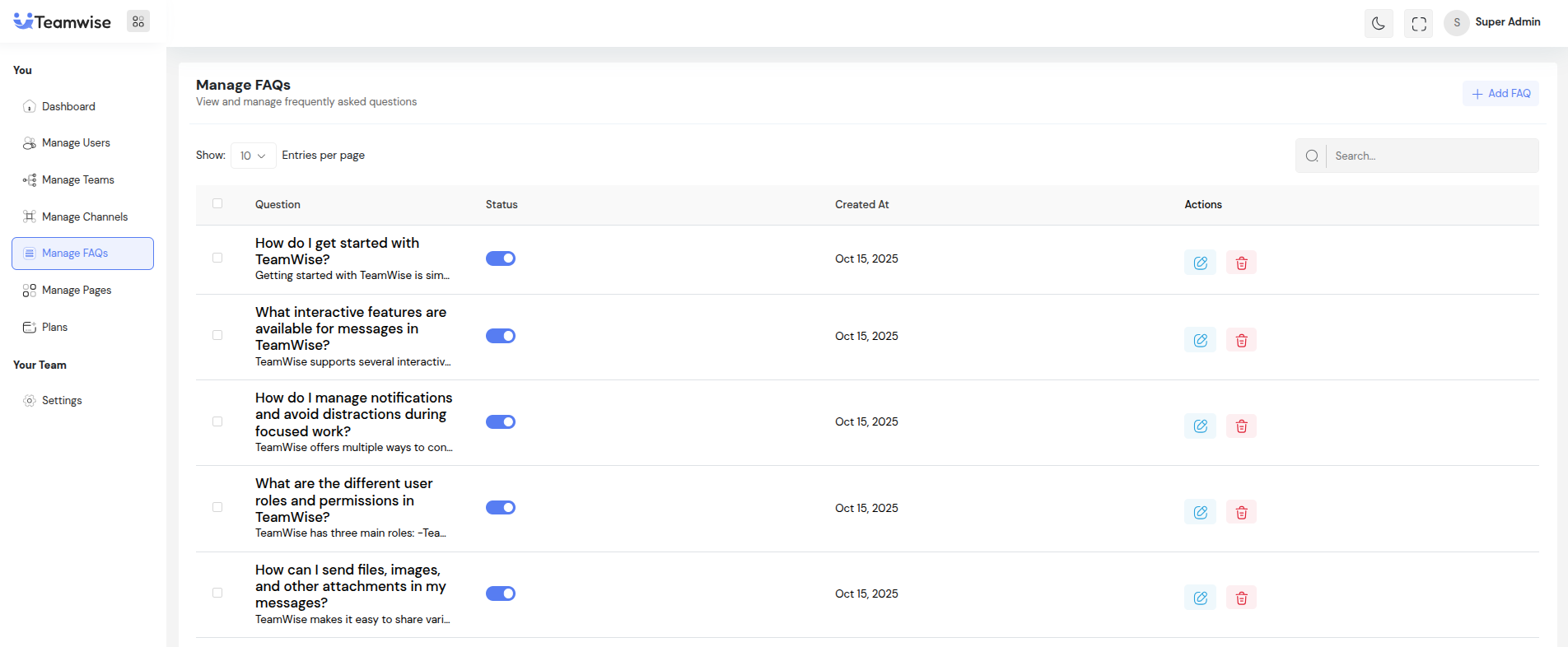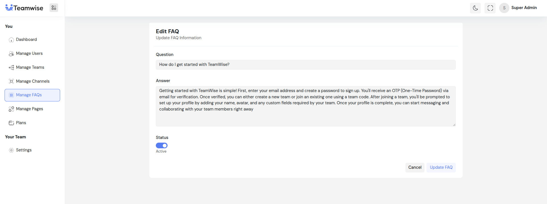 Admin can activate/deactivate FAQs using the status toggle. Active FAQs are visible to users, inactive ones are hidden. Status changes take effect immediately.