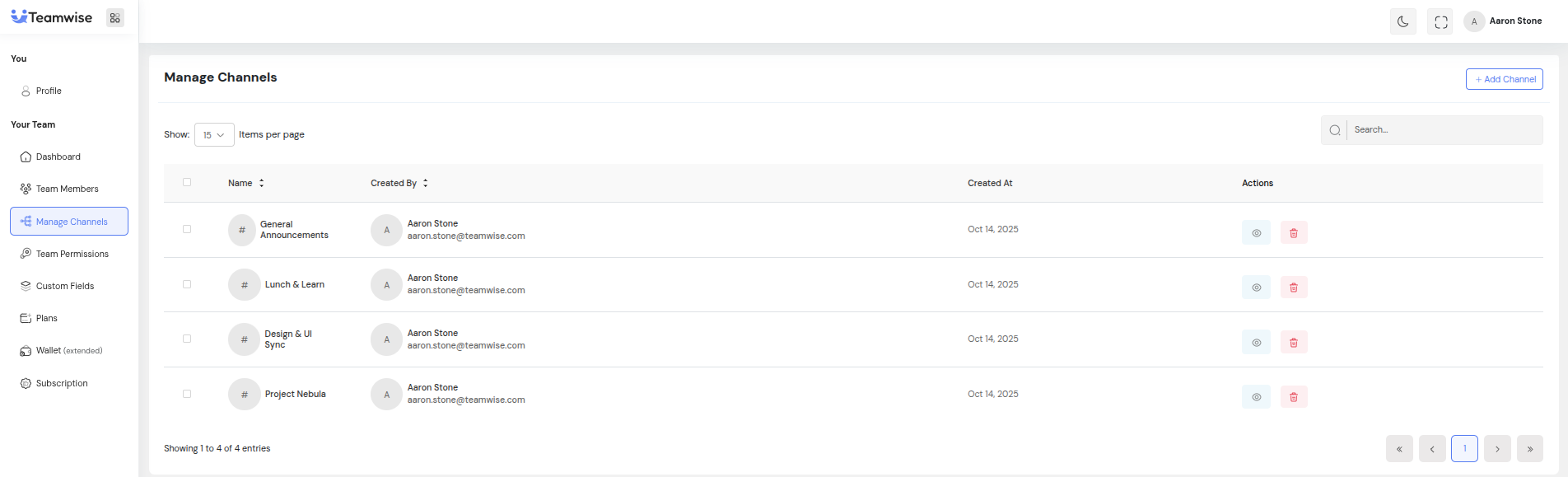 The Manage Channels module provides team administrators with complete oversight of all communication channels within the workspace. This interface enables admins to organize team discussions, control channel access, manage membership, and maintain a well-structured communication hierarchy — regardless of channel privacy settings.