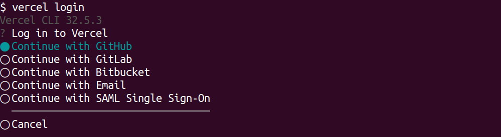 Following the installation, proceed to log in to Vercel by using the provided command.