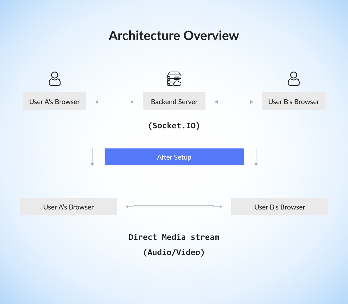 Signaling: Exchange of setup info (offers, answers, and ICE candidates) via Socket.IO before establishing the direct link.