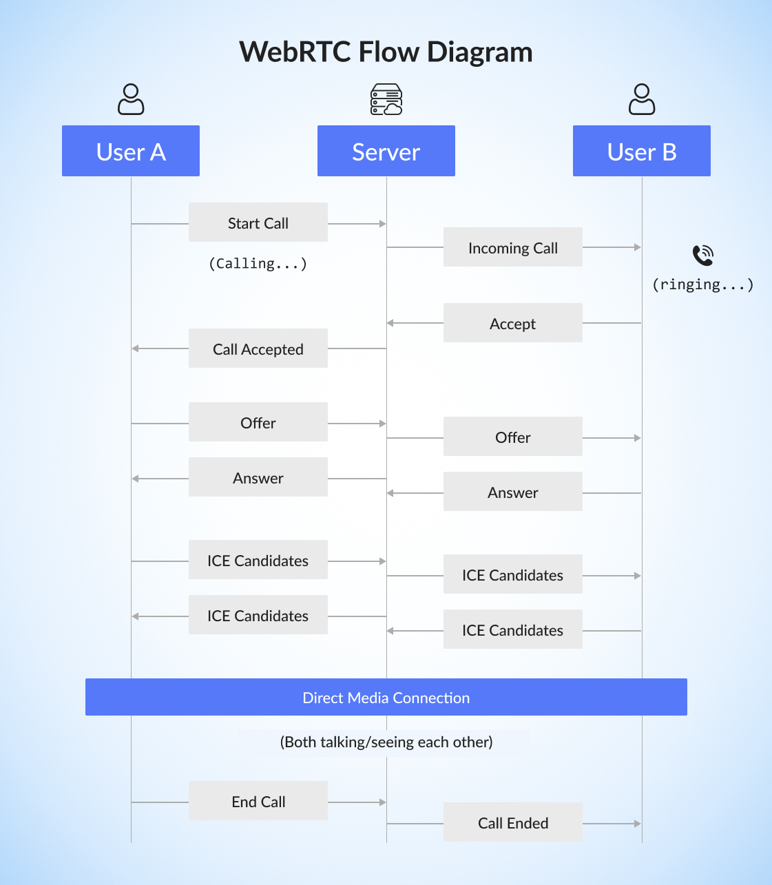 Media Phase: Audio/video streams flow directly between browsers.
